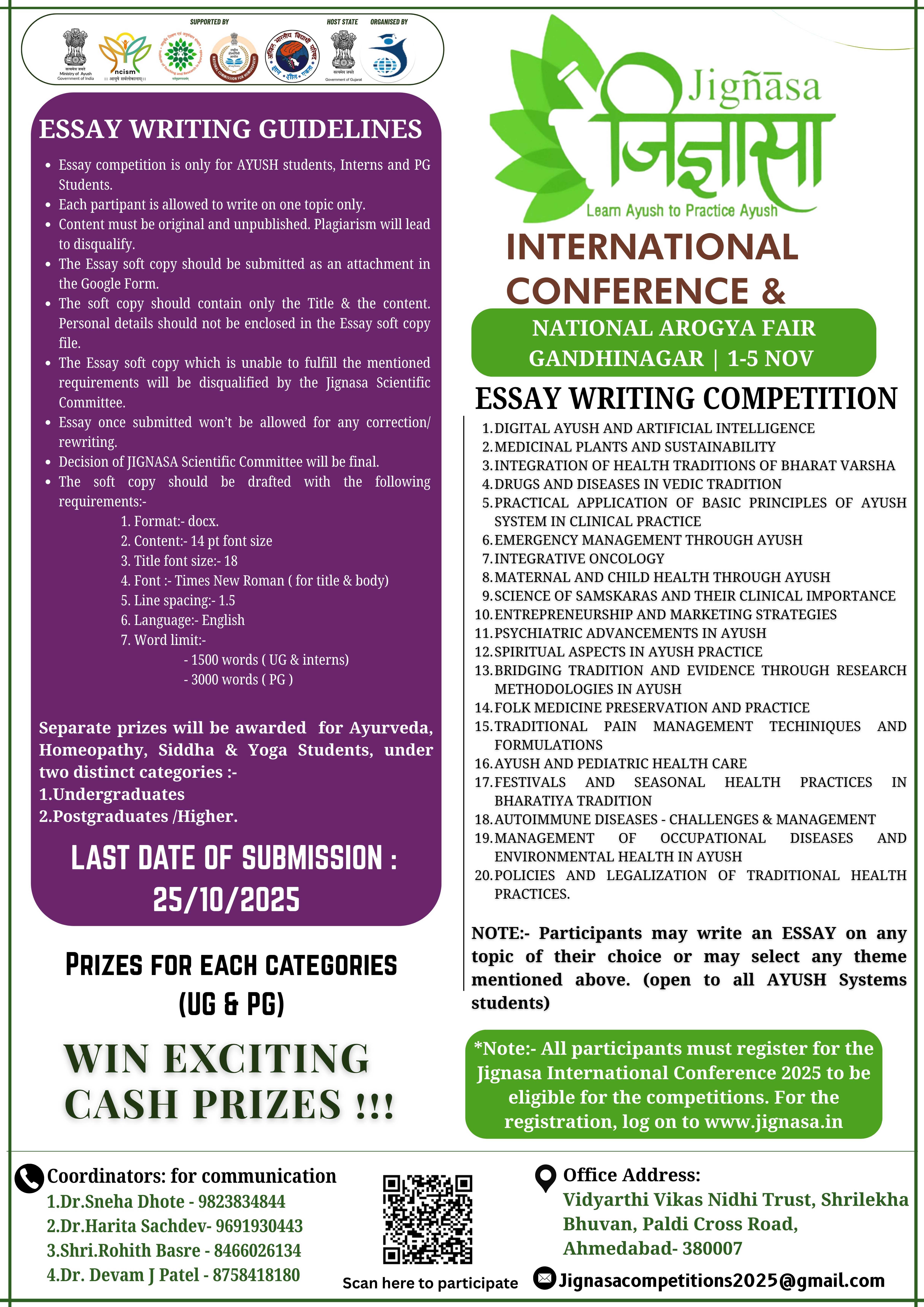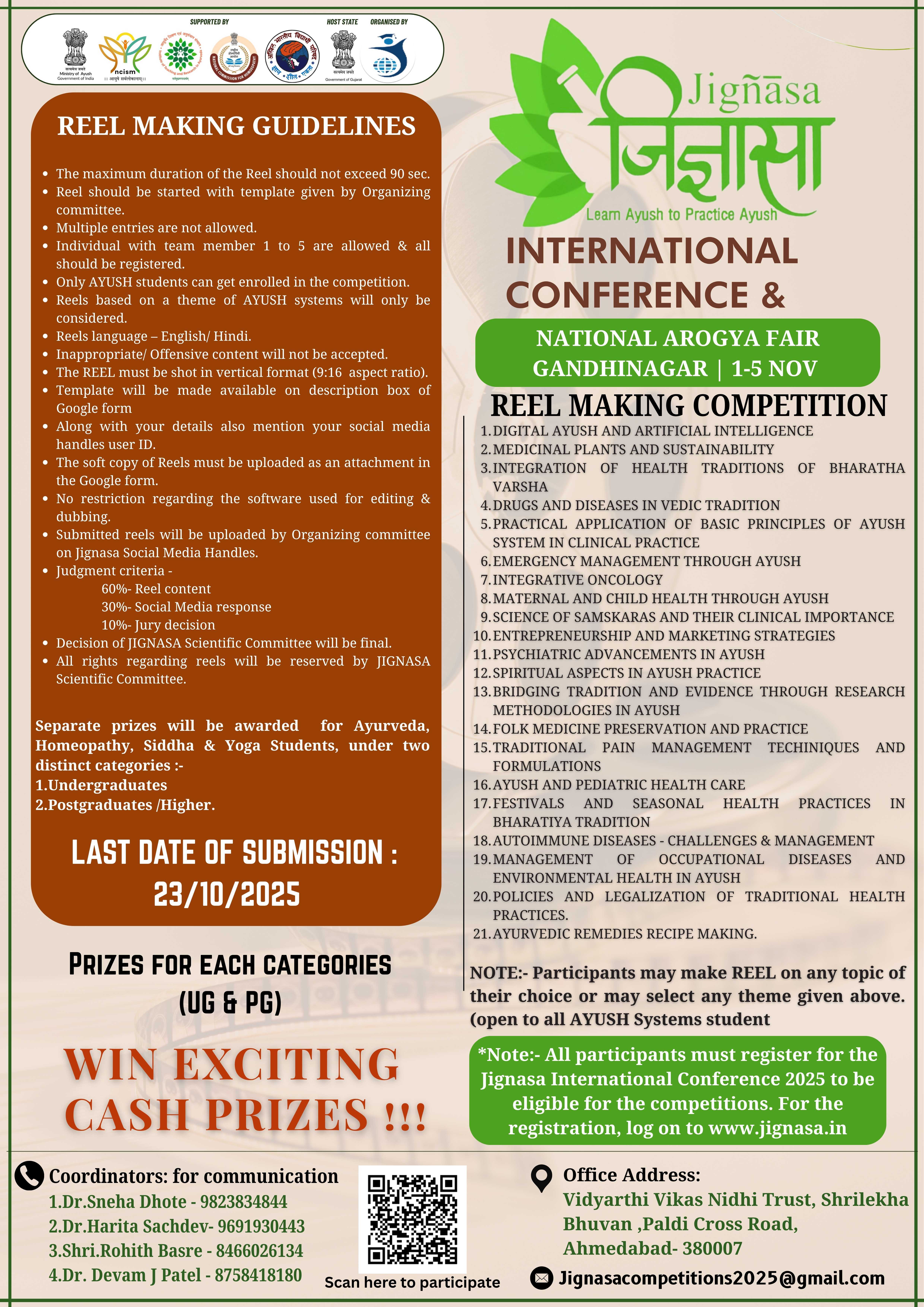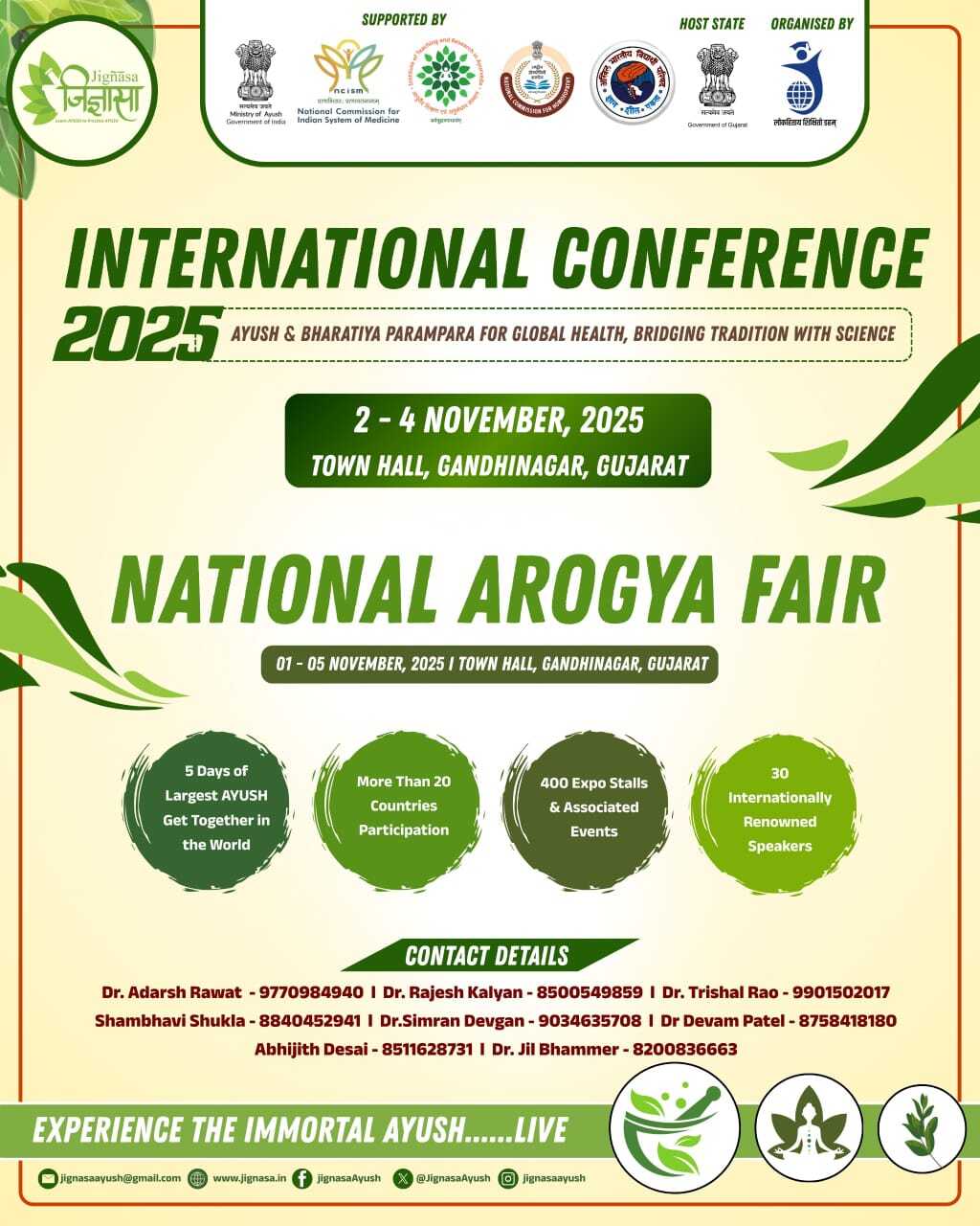 "The wait is finally over! The most awaited and grandest celebration in the world of AYUSH is here – Jignasa International Conference 2025 & National Arogya Fair 1st to 5th November 2025* at Gandhinagar, Gujarat. This is not just a conference, but a historic gathering where tradition meets innovation, uniting 20+ countries, 30+ global speakers, 400+ expo stalls, and thousands of delegates & visitors every single day. Students, scholars, and practitioners – this is your golden chance to witness the largest AYUSH get-together in the world, filled with wisdom, opportunities, and unforgettable experiences. Don’t just hear about it, be a part of it – because history in AYUSH is about to be made on dates 1st-to 5th November 2025, in Gandhinagar, Gujarat. #AYUSH #Wellness Through Tradition #International Conference 2025 #National Arogya Fair 2025 #Jignasa #Immortal AYUSH #Jignasa 2025